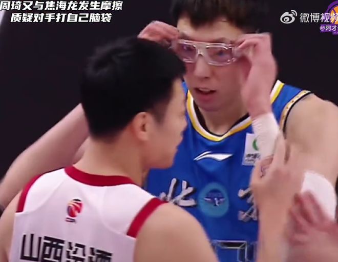 第三节末段,周琦和山西队球员焦海龙吵了起来,原来周琦 在内线持球进攻时被焦海龙击中了头部,