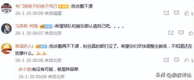有球迷在官媒点评说道:“张庆鹏再不下课,粉丝真的都打没了。希望你们尽快调整主教练,不知道还在犹豫什么。”