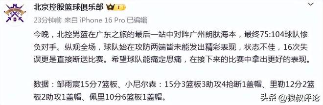 赛后,北控官方社媒发文: