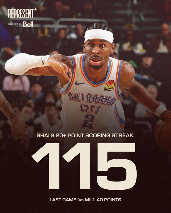 一个最直接的证明,在本场比赛过后,亚历山大已经连续115场比赛拿下20+,距离超越历史第一的张伯伦(126场)只需要12场。