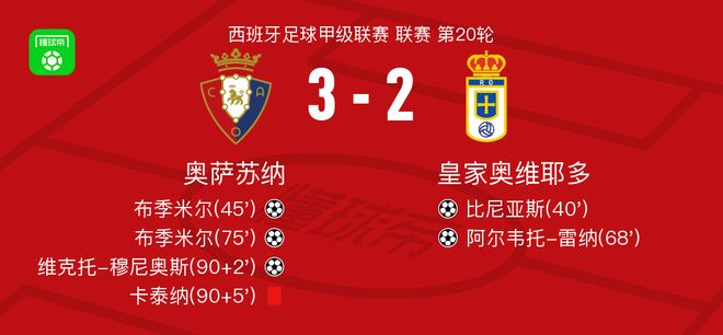 北京时间1月18日,西班牙足球甲级联赛第20轮,奥萨苏纳主场迎战皇家奥维耶多。比赛开局阶段,皇家奥维耶多由哈桑送出助攻,比尼亚斯率先破门。随后奥萨苏纳迅速回应,哈维-加兰助攻布季米尔扳平比分。上半场结束前,双方维持1比1的均势。 易边再战,皇家奥维耶多再次取得领先,卢恩戈助攻阿尔韦托-雷纳建功。奥萨苏纳持续施压,并由博约莫助攻布季米尔完成第二次破门,将比分再度拉回平衡。比赛进入补时阶段,维克托-穆尼奥斯挺身而出,攻入制胜进球,帮助主队实现反超。补时最后时刻,卡泰纳因犯规被直接红牌罚下,但奥萨苏纳仍守住胜局。 最终,奥萨苏纳以3比2战胜皇家奥维耶多,全取三分。
