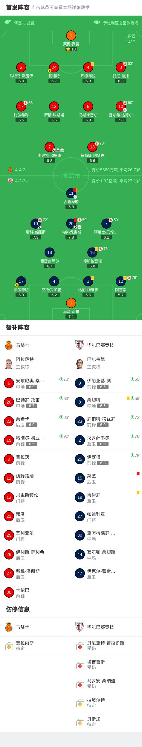 北京时间1月17日西班牙足球甲级联赛 联赛 第20轮,马略卡主场对阵毕尔巴鄂竞技。马略卡韦达特-穆里奇帽子戏法。毕尔巴鄂竞技乌奈-戈麦斯破门,尼科-威廉斯破门。最终比分马略卡 3-2 毕尔巴鄂竞技。