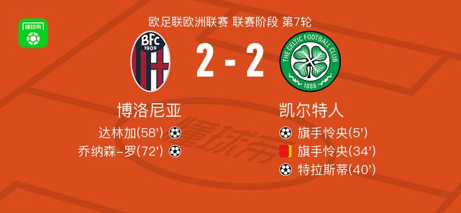 北京时间1月23日欧足联欧洲联赛 联赛阶段 第7轮,博洛尼亚对阵凯尔特人。博洛尼亚达林加破门,乔纳森-罗破门。凯尔特人旗手怜央破门,特拉斯蒂破门。最终比分博洛尼亚 2-2 凯尔特人。