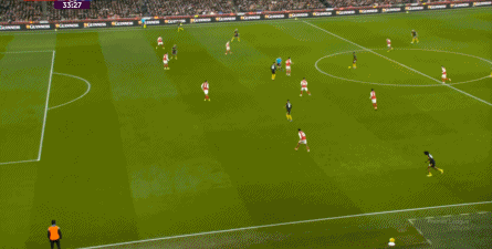 但在第34分钟,曼联打出了一次很不错的中路进攻,连续利用到了阿森纳两线之间的空间,距离扳平只差了一点点: