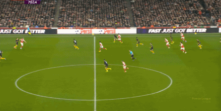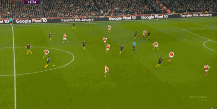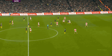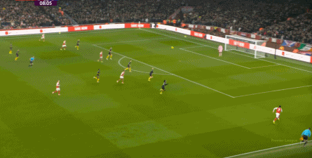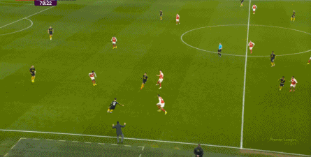 但这次进攻成型也有偶然性,因为阿森纳这一侧的中场和边后卫全部随着进攻球员压上去了,这是反击能出现的关键: