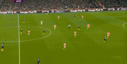 到了第50分钟,进入中路的多尔古更是和布鲁诺连续配合,直接从阿森纳的双中场之间打进去,用一脚世界波完成了比分的逆转: