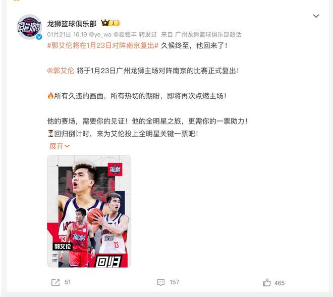 第二个消息分享一下郭艾伦复出时间敲定的情况。大家都知道在前段时间对阵广东队的比赛结束之后,郭艾伦因为伤病的问题长时间缺席广州队的比赛,到如今已经休息了差不多十场以上的比赛。而如今根据广州队官宣的最新消息,郭艾伦已经确定在1月23号对阵南京队的比赛中将会复出,到时候他也会带领广州队争取拿下这场比赛的胜利。