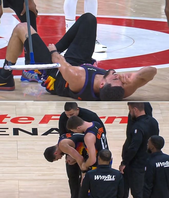 对比雄鹿队,太阳队今天更加惨烈,球队两大核心巨星布克和杰伦·格林在同场比赛中双双遭遇伤退。杰伦·格林仅仅出战4分钟就退场了,而布克狂砍31分后,第三节结束前5秒不慎踩到对手脚部,导致右脚踝90度严重扭伤,预计至少将缺席数周的时间,这对于状态正佳的太阳来讲,可谓是毁灭式的打击。