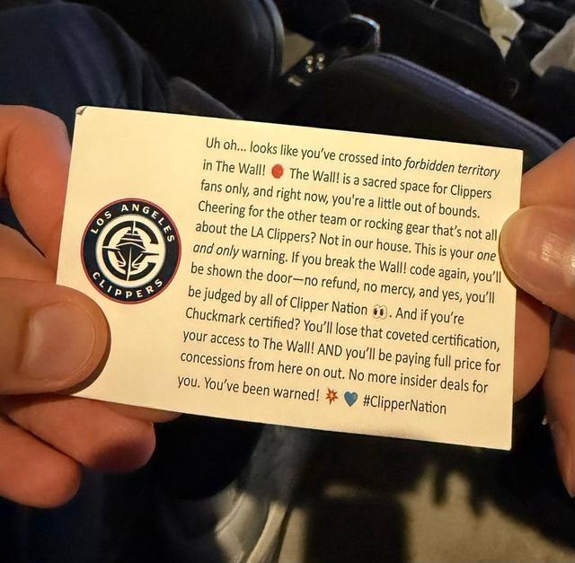 赛后,美媒ClutchPoints晒出了一张图片,图片中是快船主场发放的“警告小卡片”,这是针对于湖人球迷强行坐在快船队死忠球迷区域的警告。