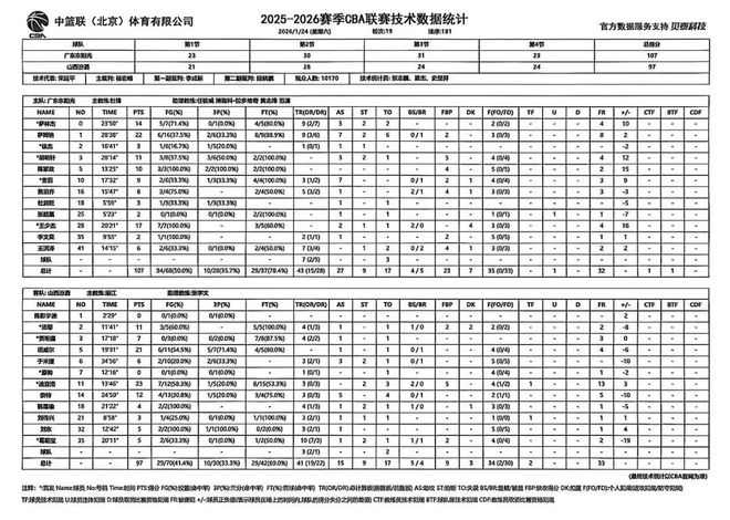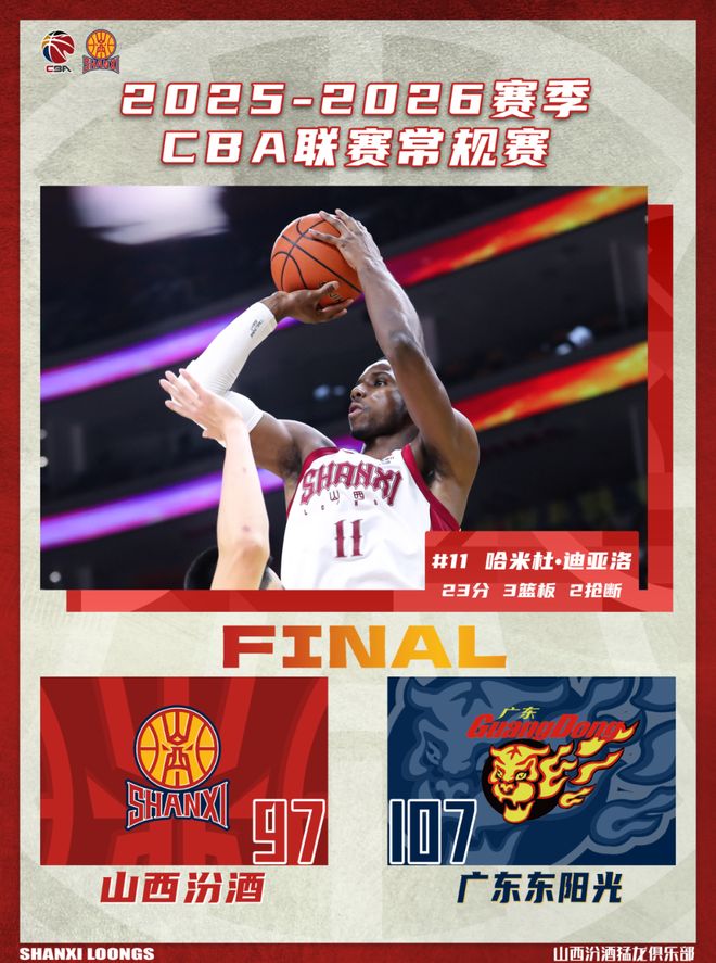 北京时间2026年1月24日19:35,2025-2026赛季CBA联赛常规赛第19轮继续进行,山西汾酒客场挑战广东东阳光。两队历史上共交手49次,山西汾酒10胜39负,上赛季两队交手7次,山西汾酒6胜1负;本赛季两队交手1次,山西汾酒0胜1负。本场比赛,双方从开局便剑拔弩张,比分持续胶着,次节山西队三分线外频频发力,一度将比分反超。但下半场对篮板球的保护不够好,处理球也过于急躁,导致最终失利,最终全场比赛结束,山西汾酒97:107不敌广东东阳光。球队在遇到困难时一直拼搏到最后,胜负只是比赛的一部分,继续努力,继续前进!