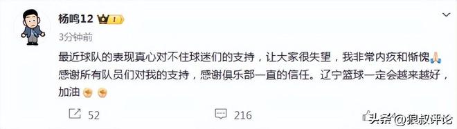随后,杨鸣社媒发文表示:最近球队的表现真心对不住球迷们的支持,让大家很失望,我非常内疚和惭愧,感谢所有队员们对我的支持,感谢俱乐部一直的信任。辽宁篮球一定会越来越好,加油。