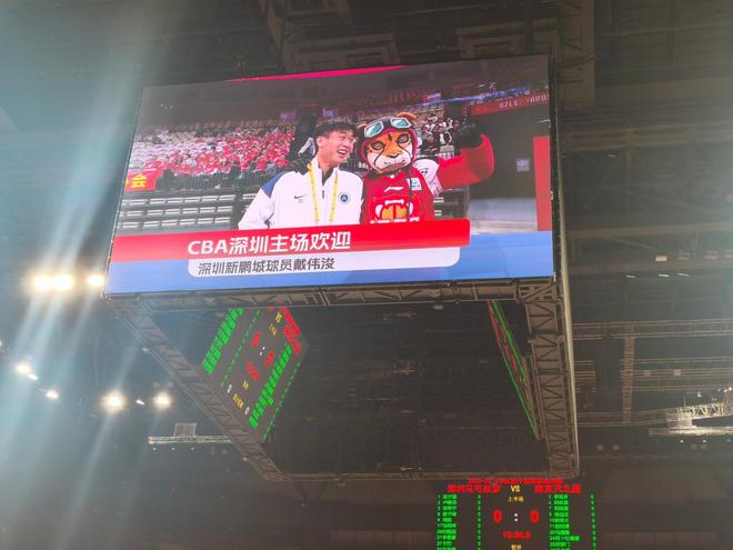 这场比赛,深圳新鹏城球员戴伟浚现场观战,还与深圳男篮的吉祥物进行了合影。