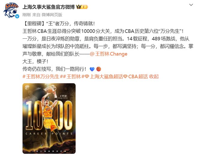 32岁王哲林CBA生涯总得分突破10000分,成为CBA历史第六位“万分先生”,上海队官博祝贺:大王,模子!