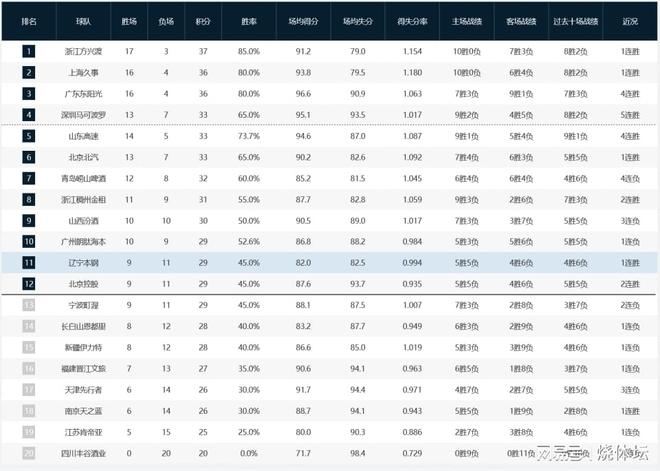 至此,辽宁男篮终结4连败,总成绩改为9胜11负积29分,最新排名攀升到第11位。四川男篮真的是烂到底了,此役之后迎来20连败,如此战绩真是辣眼睛。