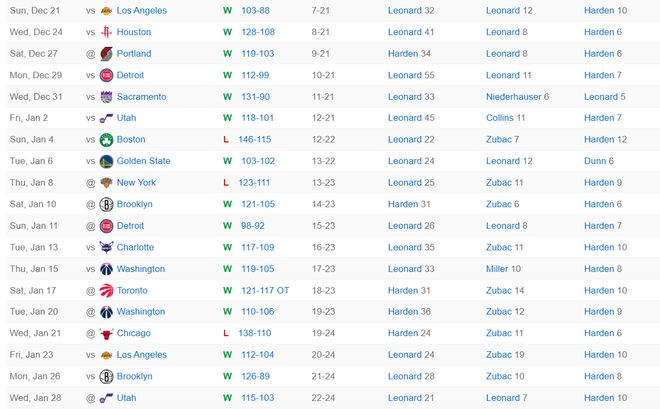 过去的19场比赛快船仅仅输给绿凯、尼克斯、公牛,期间快船击败了多支强队:湖人(2)、活塞(2)、猛龙、勇士、开拓者。