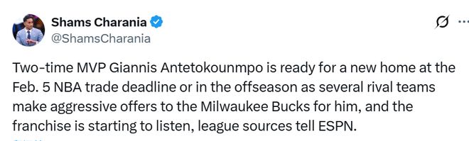 北京时间1月29日,据名记Shams报道,联盟消息人士向ESPN透露,两届常规赛MVP得主字母哥已做好在2月5日交易截止日前更换东家的准备。多支球队已向密尔沃基雄鹿队开出重磅报价,而雄鹿方面目前也已开始听取相关方案。