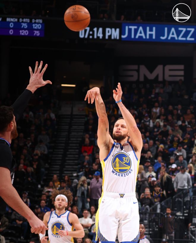 库里27分总得分超皮尔斯!勇士8人上双23记三分大胜爵士