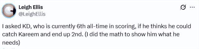 NBA记者埃利斯通过计算后告知杜兰特:要想超越贾巴尔,成为历史得分榜的第二,杜兰特需要在接下来出战的268场比赛中,保持场均25分的水准。