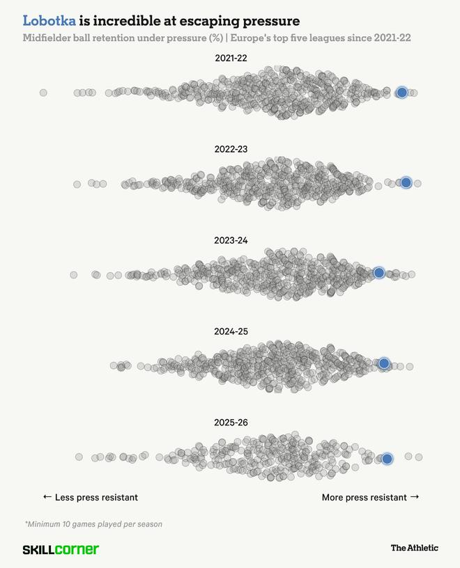 多年来,这位身材矮小的斯洛伐克中场一直是欧洲最擅长抗压控球的球员之一。当The Athletic向他展示SkillCorner数据,证明他在高压下的控球能力时,洛博特卡腼腆地表示:“我真的很惊讶自己能这么出色。