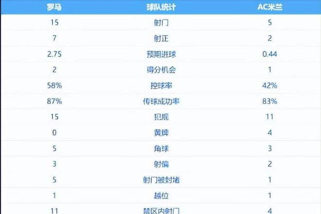 罗马队在多项数据上占据优势,他们的射门次数为15次,射正7次,而AC米兰这两项数据分别为5次和2次,罗马队的控球率接近六成,并获得5个角球。