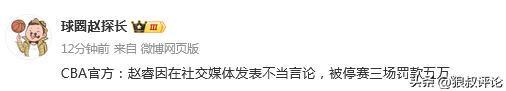 北京时间2月11日,CBA官方公示,北京男篮球员赵睿不当言论罚单,他将会被禁赛3场,罚款5万,而北京男篮则是核减经费5万。