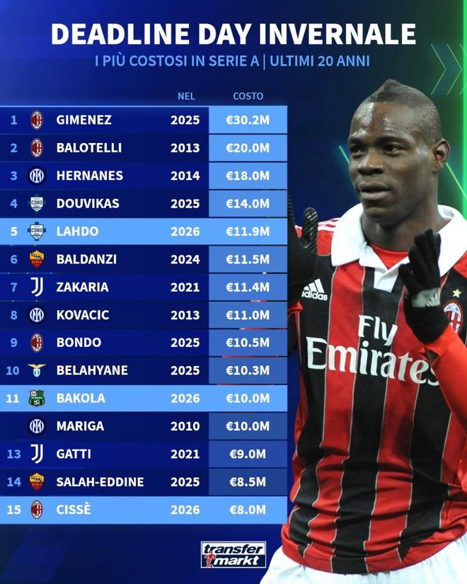 北京时间2月3日,德转统计出了2006年以来意甲冬窗截止日最贵的15笔交易,AC米兰2025年冬窗3020万欧元引进圣地亚哥-希门尼斯排名第一,2013年AC米兰2000万欧元引进巴洛特利排名第二,国际米兰2014年1800万欧元引进埃尔纳内斯第三。