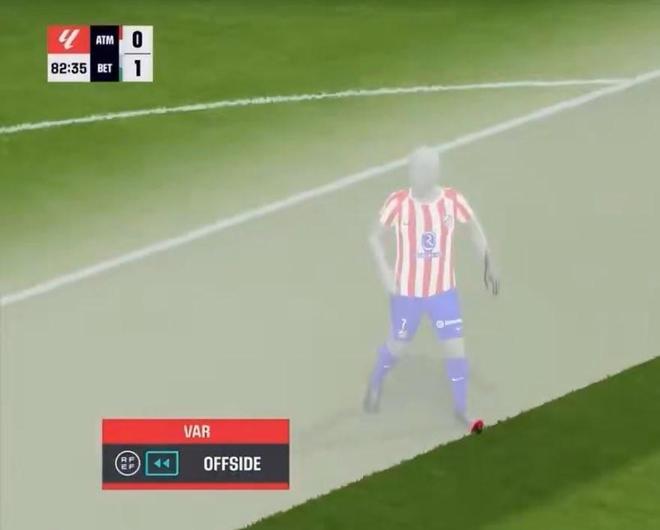 下半场第76分钟,马竞造成迭戈-略伦特不幸乌龙,但VAR介入后判罚格列兹曼越位在先,这粒进球被吹,VAR划线镜头显示,格列兹曼的脚尖稍稍越位。