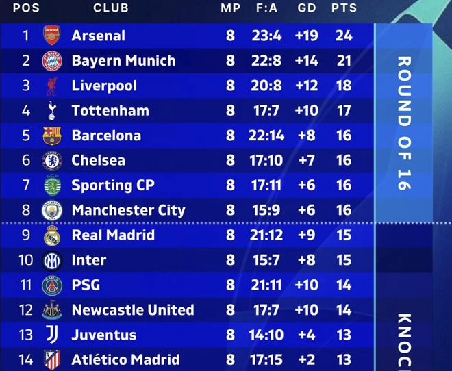 热刺在英超联赛中保级,在欧冠中则判若两队。热刺5胜2平1负积17分,高居欧冠36强中的第4位,排在英超对手切尔西、曼城、纽卡之前。另外西超三强中的巴萨16分第5,皇马15分第9,马竞13分第14。可以说皇马本赛季无缘欧冠前8名直接出线与热刺的存在有直接关系,如果热刺在欧冠跟在英超中一样狼狈,那热刺将无法拿到直通欧冠淘汰赛的名额,皇马将上升1名直通16强。