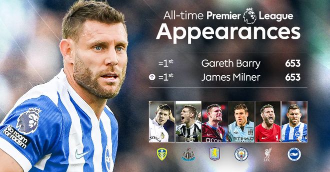 米尔纳的637场英超足迹遍布利兹联(48场)、纽卡斯尔(94场)、阿斯顿维拉(100场)、曼城(147场)、利物浦(230场),如今在布莱顿已出场34次。他有望在2月21日布莱顿客战布伦特福德时独享历史第一的宝座。
