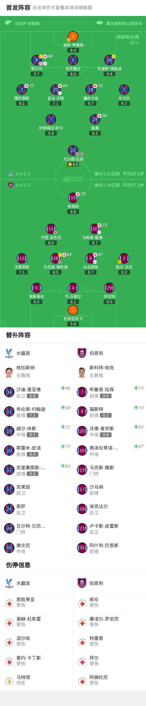 第17分钟,加盟首球,亚当-沃顿助攻尤尔根-拉森破门,水晶宫1-0