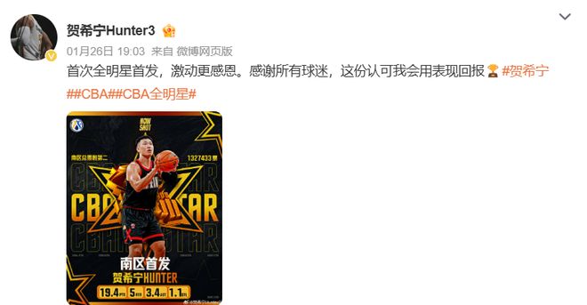 对了,贺希宁今年还生涯首次入选全明星首发,球迷用投票证明了他本赛季的发挥的确无比亮眼。