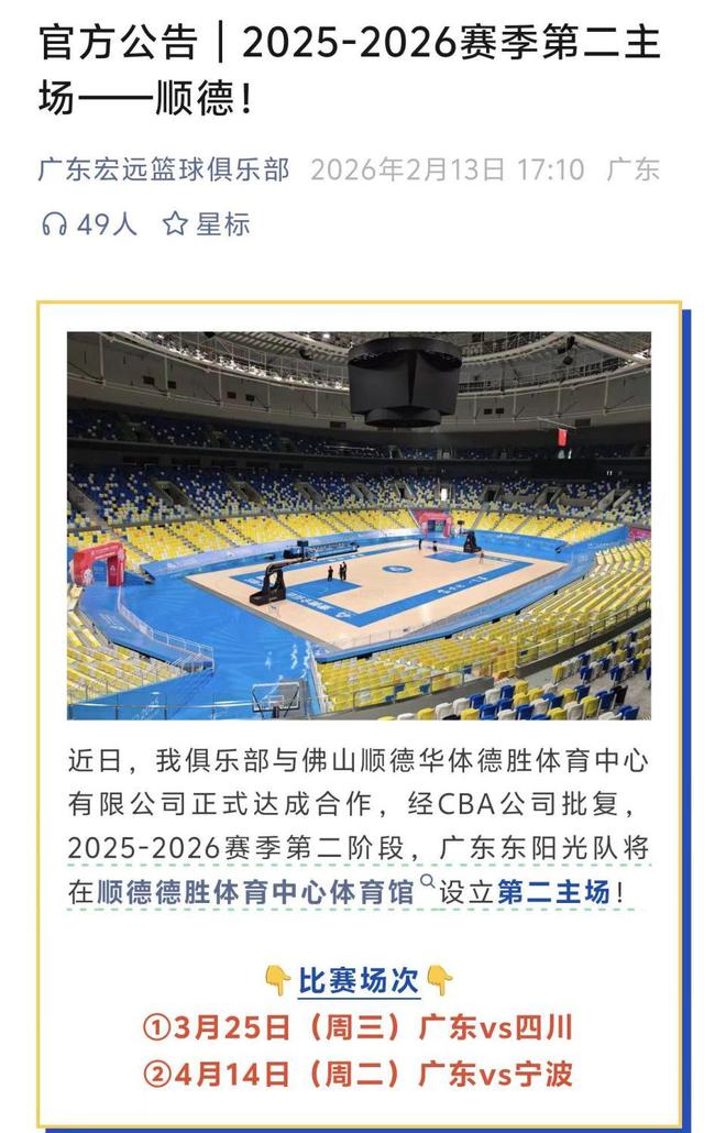 根据广东宏远篮球俱乐部发布的消息,在常规赛第二阶段他们将启用本赛季的第二个主场,顺德德胜体育中心体育馆,本赛季广东队在这个球馆的比赛只有两场,分别是3月25日广东主场对阵四川队的比赛,以及4月14日广东对阵宁波队的比赛,其余的主场比赛依旧在东莞东风日产问文体中心体育馆。