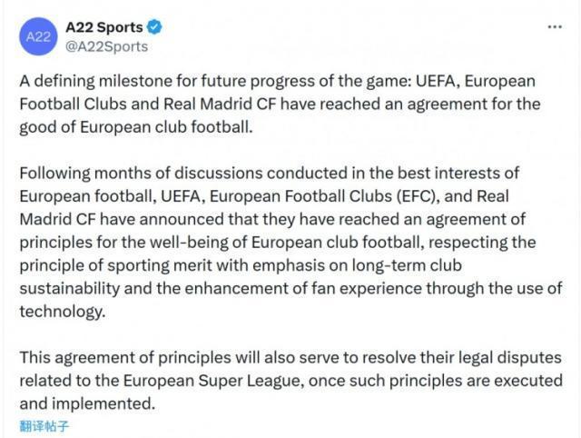 2月13日讯 欧超公司A22社媒发表声明,确认欧足联、皇马、欧洲俱乐部协会达成原则协议,正式终结持续5年的欧超联赛项目及相关法律纠纷。“足球运动未来发展的里程碑:欧足联、欧洲俱乐部协会与皇马已达成有利于欧洲俱乐部足球发展的协议。历经数月以欧洲足球最佳利益为宗旨的磋商,欧足联、欧洲俱乐部协会与皇马宣布达成原则性协议,旨在保障欧洲俱乐部足球的健康发展。该协议恪守竞技价值原则,着重提升俱乐部长期可持续性,并通过技术手段优化球迷观赛体验。该原则性协议在落实执行后,也将有助于解决欧洲超级联赛的相关法律纠纷。”