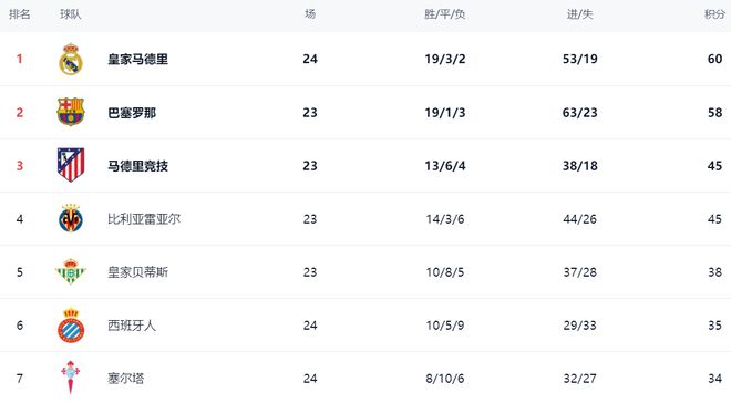 在积分榜上,皇马以60分登上榜首位置。而巴萨则掉到了第2的位置。巴萨总积分是58分,比皇马少了2分。不过,巴萨少踢1轮。如果接下来巴萨能够击败赫罗纳,那么还是能够重登榜首。马竞只拿到45分,排名第3。第4的是比利亚雷亚尔,也是45分。皇家贝蒂斯以38分排名第5。西班牙人以35分排名第6。