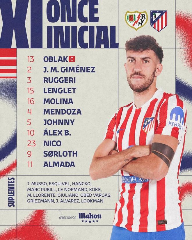 马德里竞技首发:13-奥布拉克、2-希门尼斯、3-鲁杰里、15-朗格莱、16-莫利纳、4-门多萨、5-卡多佐、10-巴埃纳、23-尼古拉斯-冈萨雷斯、9-瑟洛特、11-阿尔马达
